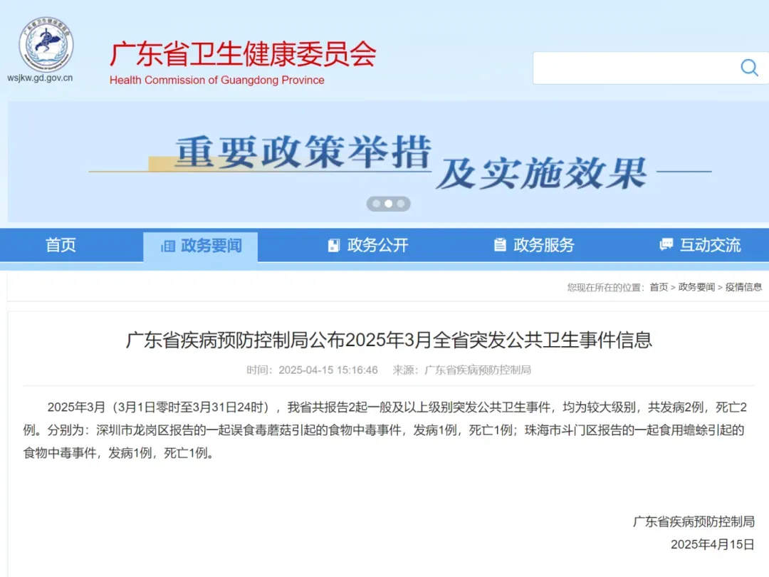 2025年3月(3月1日零时至3月31日24时),广东省共报告2起一般及以上级别突发公共卫生事件,均为较大级别,共发病2例,死亡2例。